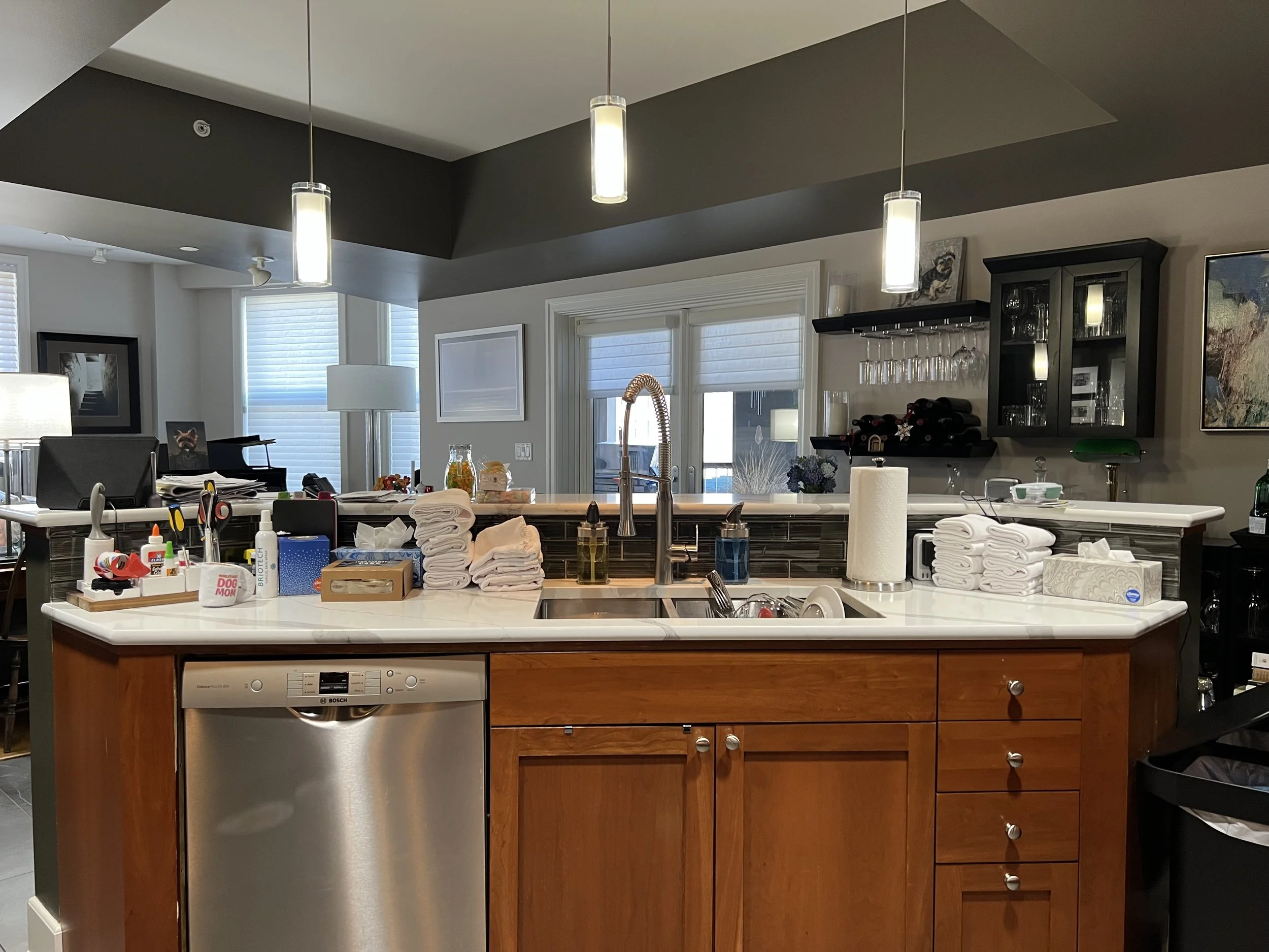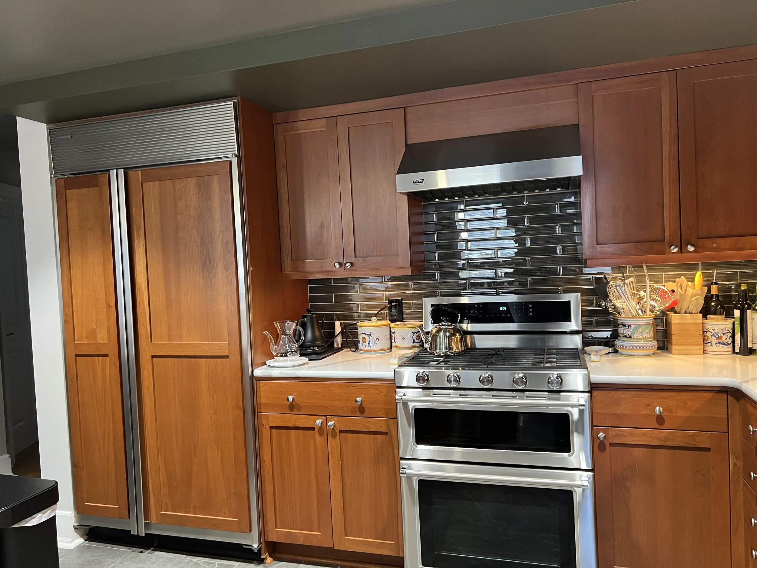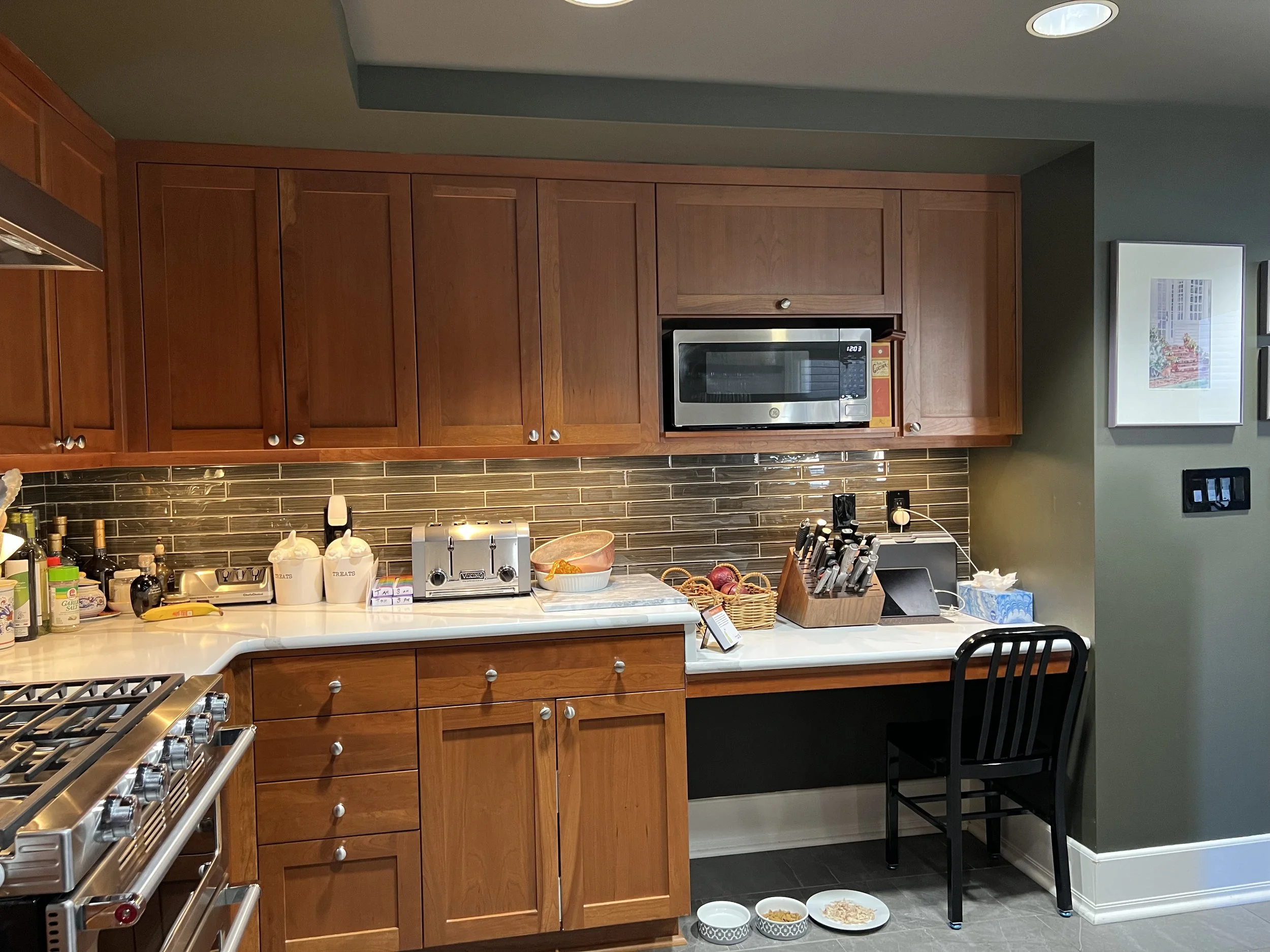 Narrow walkways, bar height countertop, and an unused desk left residents wanting more from this traditional kitchen.